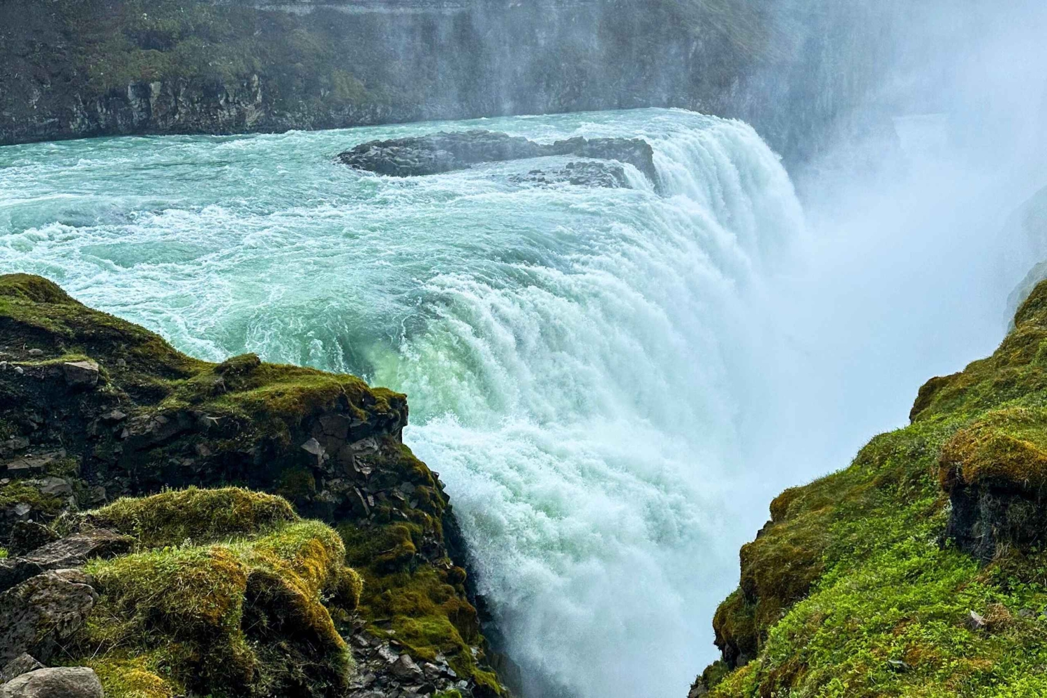 Efter frokost besøger du Gullfoss, et af Islands mest kraftfulde og elegante vandfald. Dens todelte kaskade tordner ned i en robust kløft og sender tåge op, der ofte danner lyse regnbuer på solrige dage. Det er et betagende højdepunkt på Den Gyldne Cirkel.