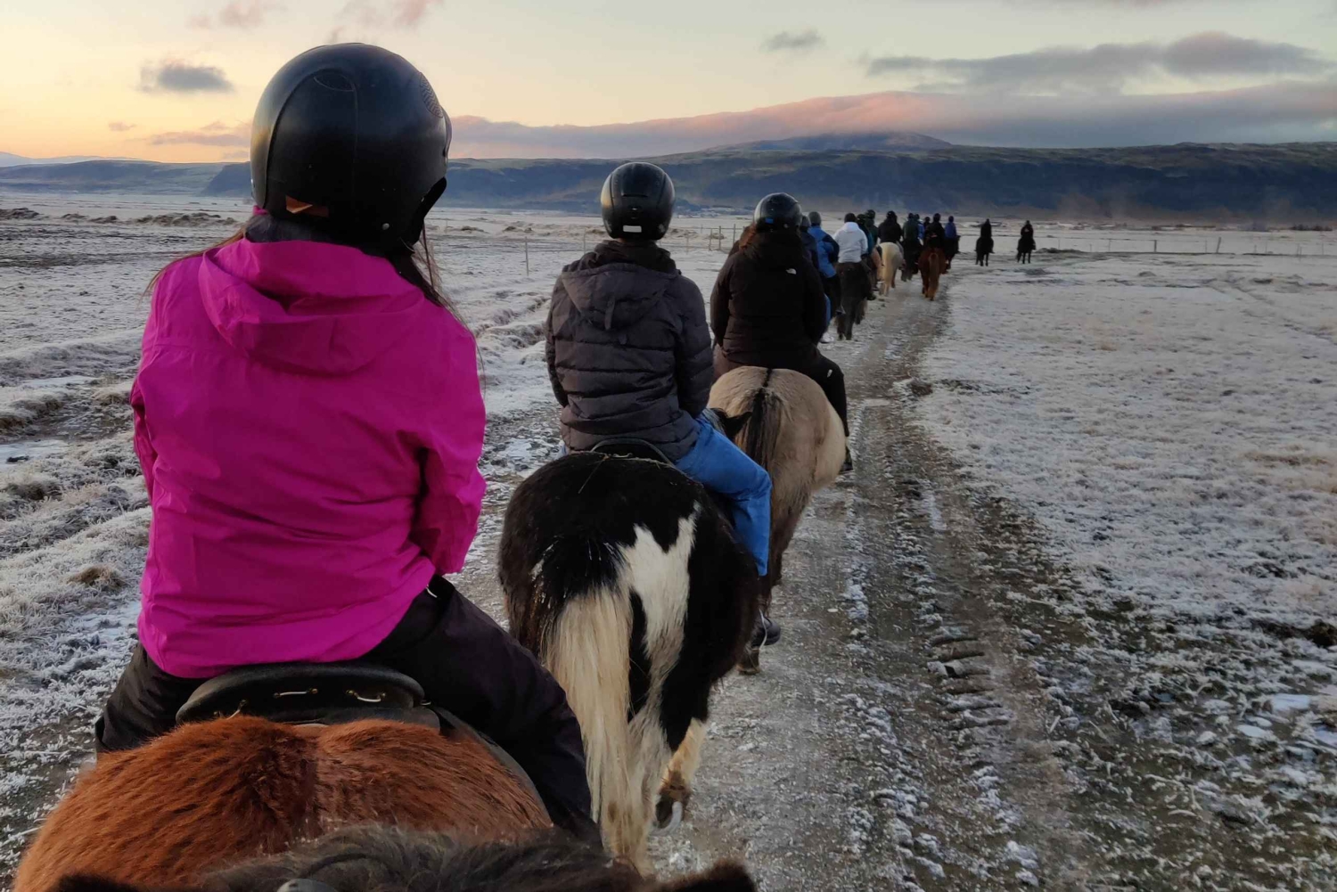 En esta excursión, ofrecemos las mejores rutas a caballo disponibles, dependiendo de las condiciones meteorológicas y del viento. Cabalgamos por los pintorescos alrededores de nuestra granja, pasando por prados, campos de lava y un pequeño río. Por el camino, disfrutamos de las hermosas vistas de las montañas volcánicas y las tierras de labranza, y pasamos por varias granjas, lo que nos da una idea de cómo se ha desarrollado la agricultura en las últimas décadas. Los agradables senderos a caballo también ofrecen una gran oportunidad de experimentar el andar especial del caballo islandés, el 'tölt'.