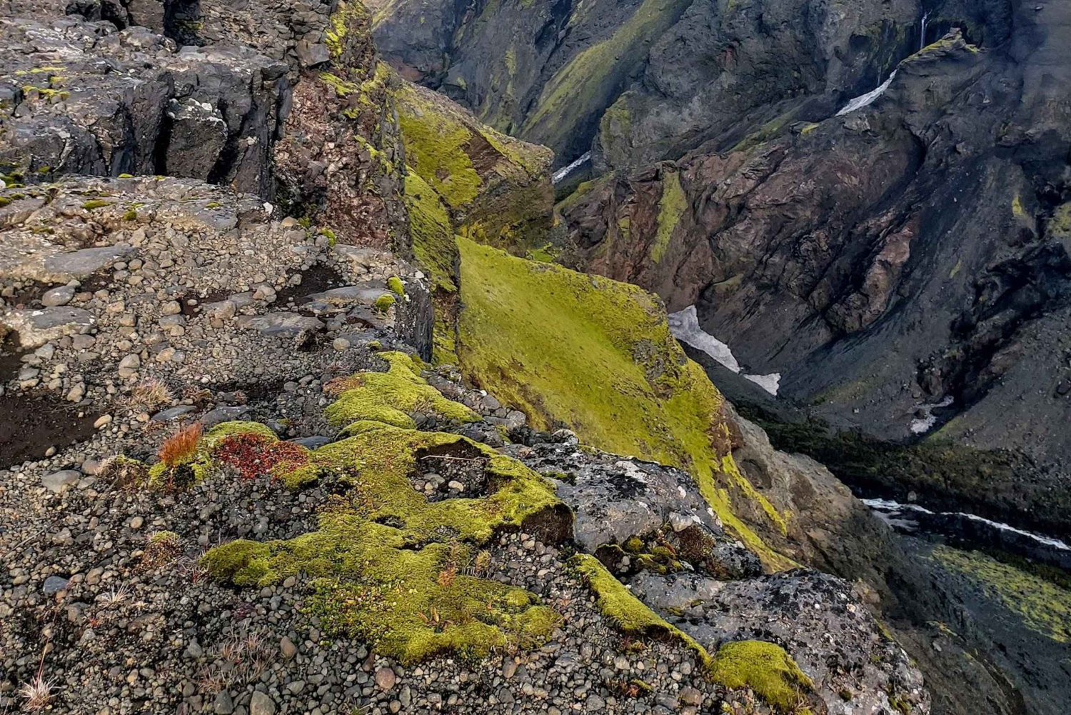 Fimmvörduháls trail will take you up through “Waterfall Way”, where 26 waterfalls await you, up to the site of the 2010 Eyjafjallajökull eruption that made the news as the volcanic eruption shut down air traffic in Europe for a couple of days. This world-famous trail also passes through a harsh mountain pass, deep canyons, and the sumptuous Thórsmörk valley.