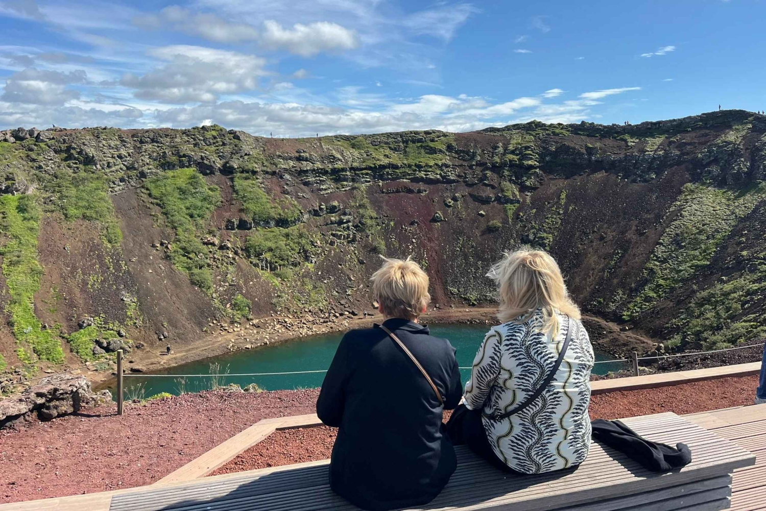 Kerið Crater: End your tour with a visit to Kerið, a volcanic crater lake with strikingly vibrant blue waters. Located in the Grímsnes area, this natural wonder is a must-see on the Golden Circle route. Please note that admission is 600 ISK per person (not included, paid at location).