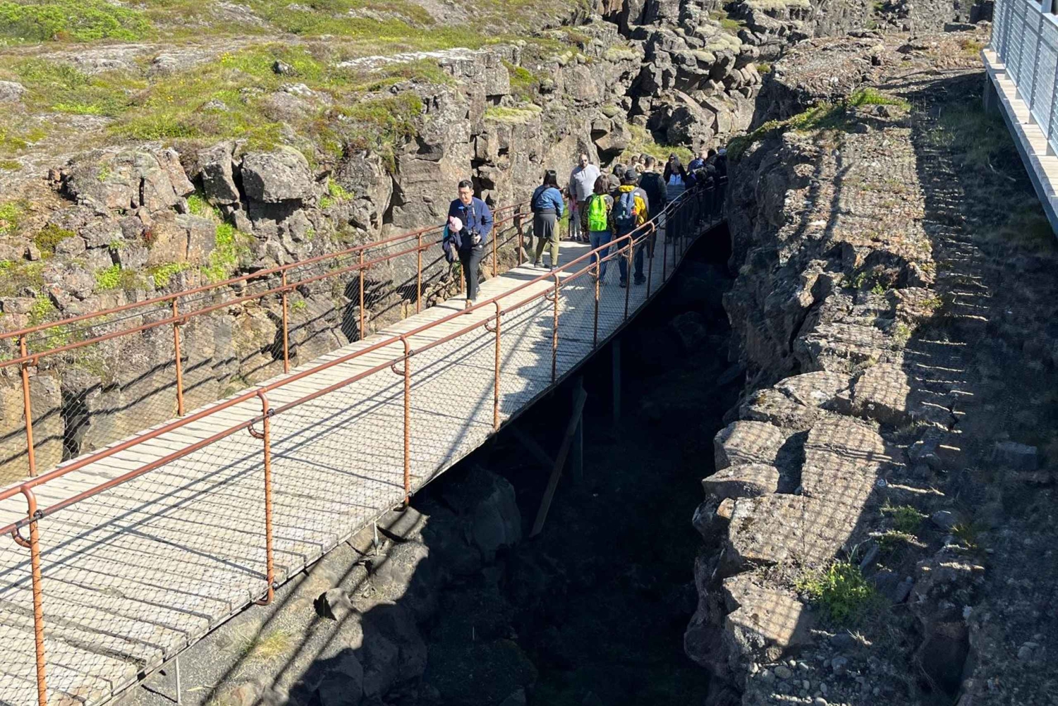 Begin your tour with a visit to Þingvellir National Park: Begin your journey at this UNESCO World Heritage Site, where the American and Eurasian tectonic plates meet. Walk between the continents as the plates slowly drift apart, and immerse yourself in the historical and geological significance of this remarkable location.