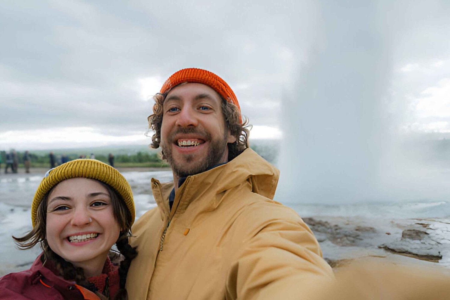 Next, you’ll explore Sólheimajökull Glacier, where you can see the amazing blue ice and learn how Iceland’s glaciers are formed. After the South Coast, you’ll continue to the famous Golden Circle. See the Geysir Hot Springs, where the Strokkur geyser shoots hot water into the air every few minutes. Visit the powerful Gullfoss Waterfall, where the river crashes down into a deep canyon. Finally, walk between two continents at Þingvellir National Park, a special place with both natural beauty and Icelandic history.