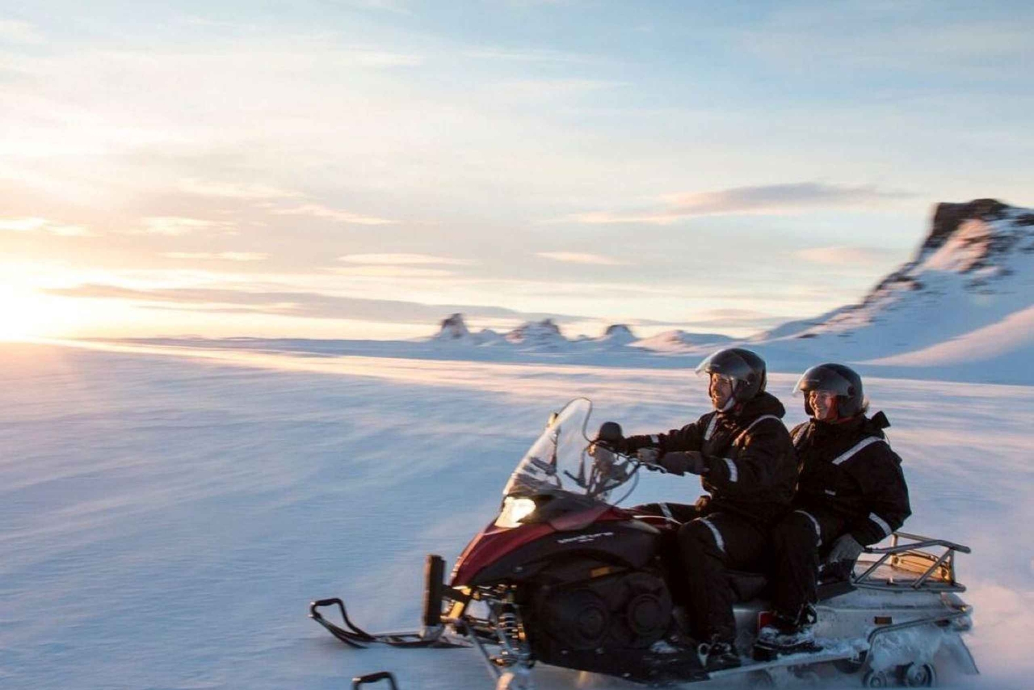 Experience Iceland’s Golden Circle with a thrilling snowmobile adventure. Visit Thingvellir, Oxarafoss, Bruarfoss, Geysir, and Gullfoss, then ride a glacier for unforgettable snowmobiling experience.