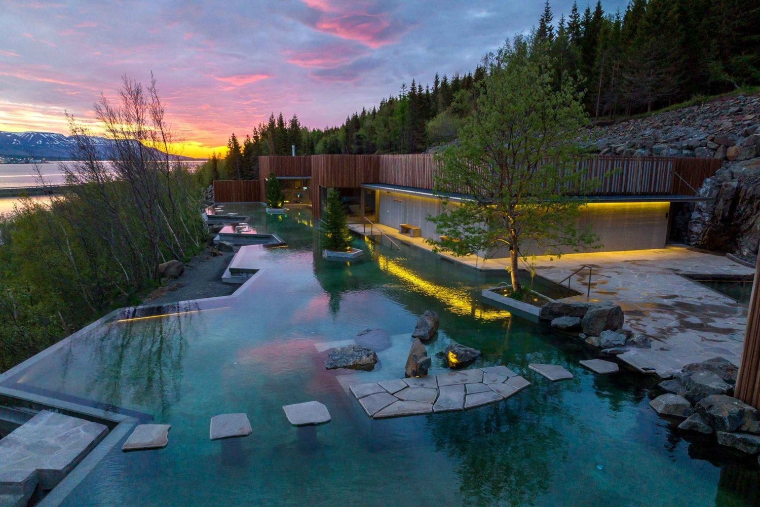 Travel north via the Hvalfjörður Tunnel to Borgarnes and Skagafjörður Fjord, known for Icelandic horses. Visit the Glaumbær Turf Museum, showcasing traditional farm life, then cross the Öxnadalsheiði plateau to reach Akureyri, the capital of North Iceland. Optional evening visit to the Forest Lagoon geothermal spa. Overnight in Akureyri.