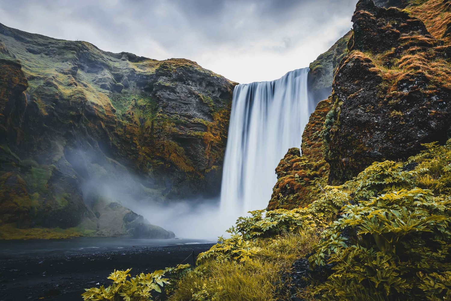 - Skógafoss est une puissante chute d'eau avec des points d'observation en haut et en bas.