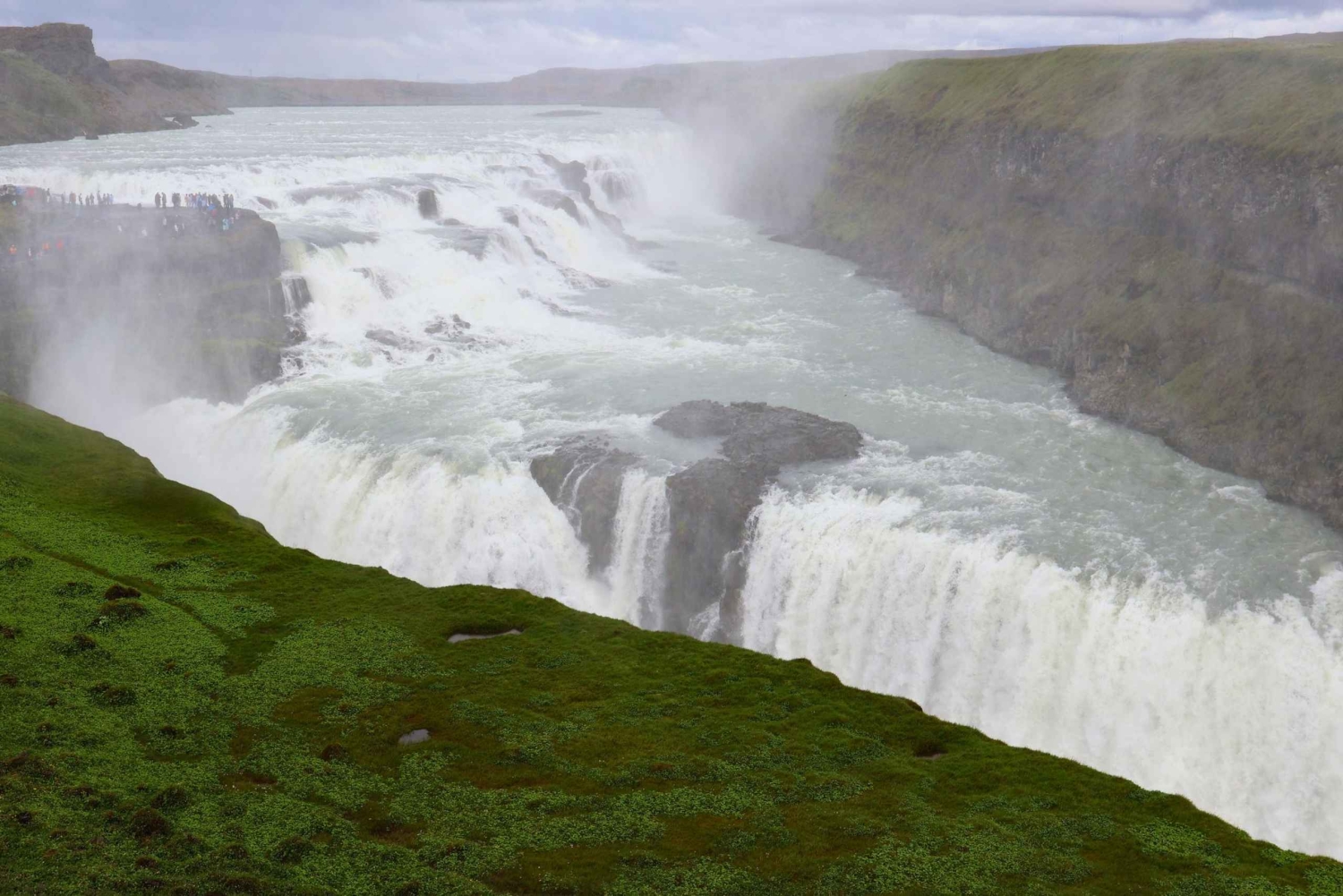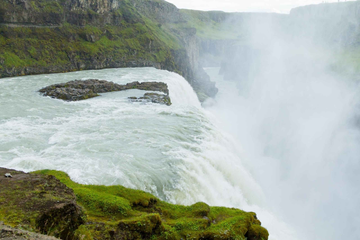 Prosegui fino a Gullfoss, dove l'acqua glaciale tuona su due spettacolari cascate in un canyon aspro. La nebbia si solleva nell'aria e spesso compaiono arcobaleni alla luce del sole, uno spettacolo indimenticabile della potenza grezza dell'Islanda e uno dei suoi luoghi più iconici.