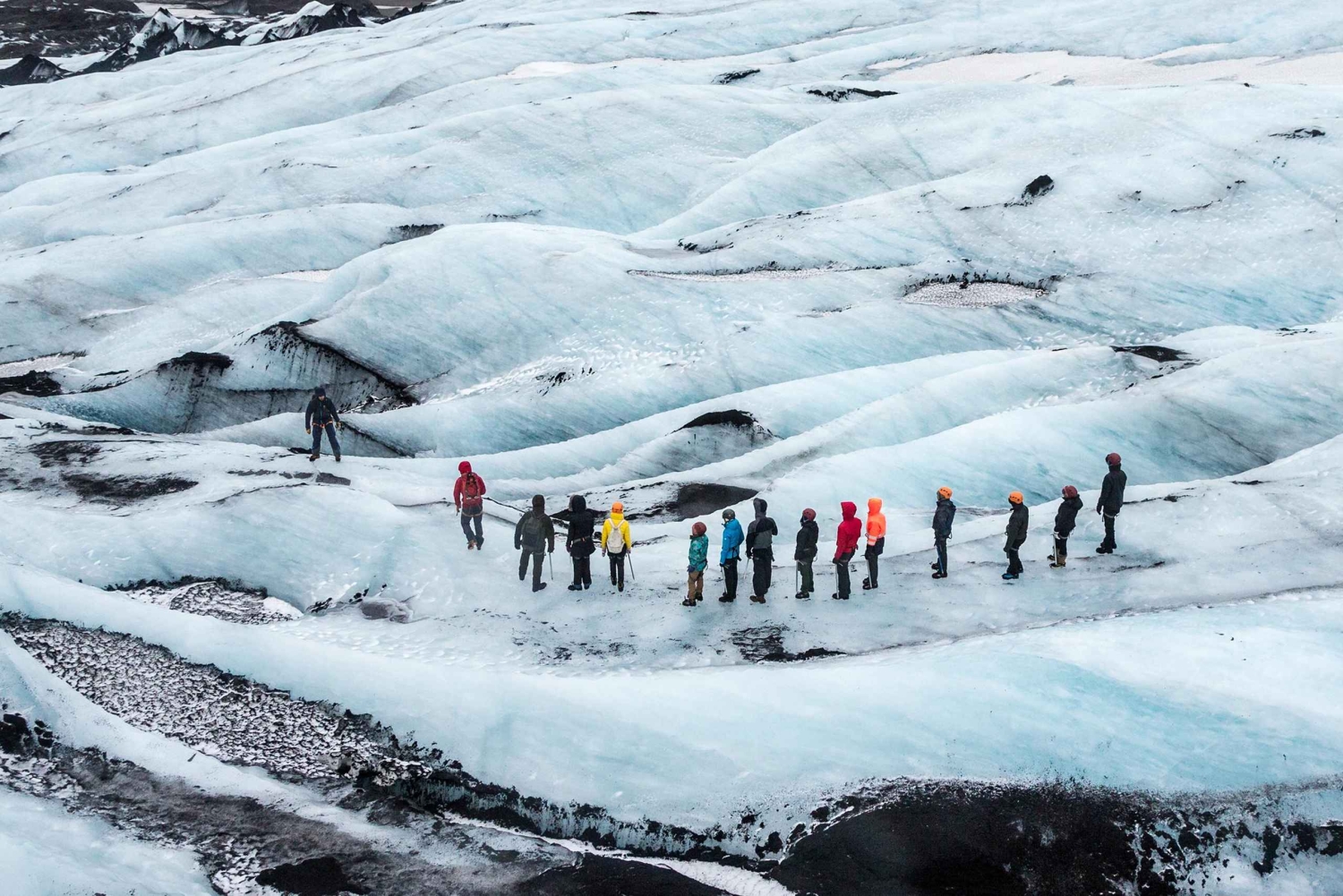 Viaggiando attraverso paesaggi sensazionali, arriverai al ghiacciaio Sólheimajökull per una passeggiata sul ghiacciaio. La tua guida certificata ti darà l'attrezzatura per il ghiacciaio. Scoprirai tutto sul ghiacciaio, i suoi movimenti, i crepacci e la sua formazione. Sentirai persino il rumore del ghiaccio antico che si rompe quando si muove.