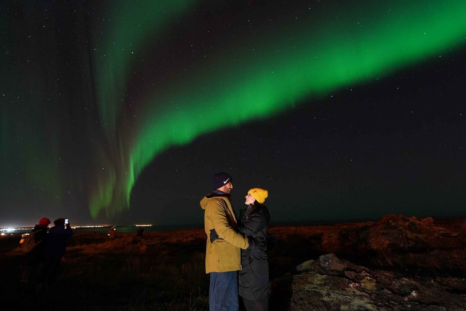 Verrai riportato al luogo di prelievo originale a Reykjavík intorno alle 19:00. Avrai tempo per cenare e poi verrai ripreso dal punto di partenza per il tour dell'aurora boreale. Dalla capitale, andrai a caccia dei colori brillanti dell'aurora boreale nella campagna: di solito si vedono aurore boreali verdi, gialle, bianche e talvolta viola. L'aurora boreale non può mai essere garantita, ma la tua guida farà del suo meglio.