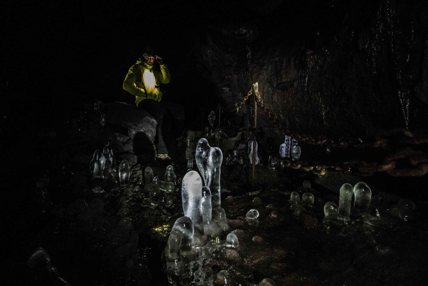 私たちが訪れる洞窟はレイダレンディと呼ばれています。900メートルの長さの溶岩洞には、鍾乳石や棚などのユニークな岩層があります。軽い這いずりは必要かもしれませんが、レイダレンディ洞窟はアイスランドの溶岩原の地下世界の驚異に比較的簡単にアクセスできます。ユネスコ世界遺産のシンクヴェトリル国立公園の真水割れ目シルフラでシュノーケリングをします。シルフラは世界最高のダイビングスポットの1つです。