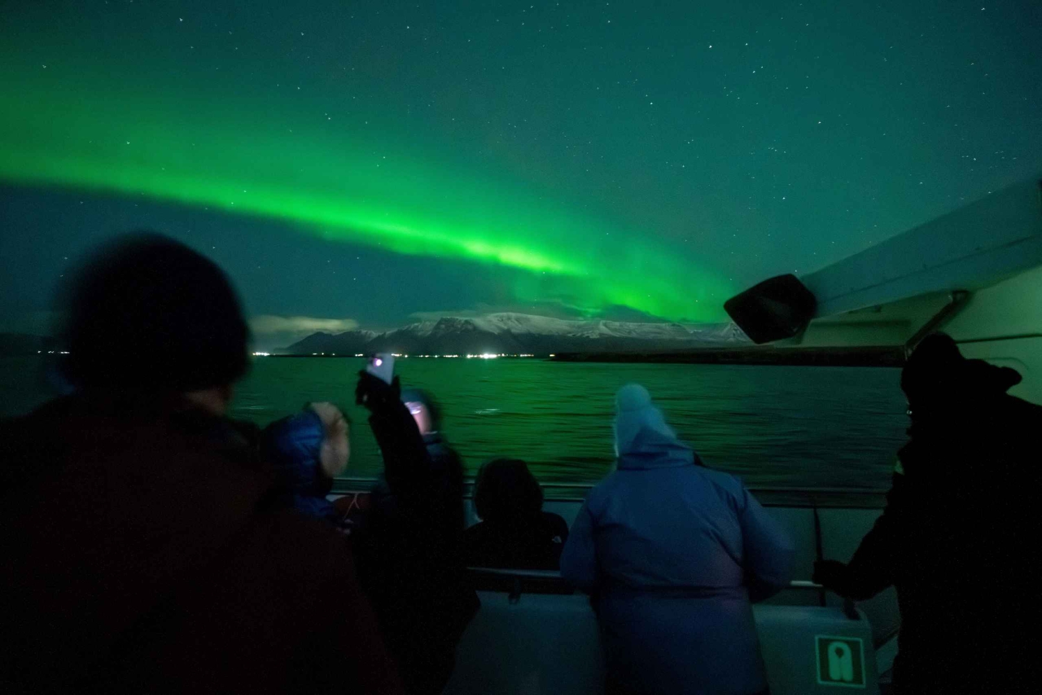 海からオーロラを楽しむのは素晴らしい経験です。レイキャビクの海岸線から離れ、北大西洋のオーロラを見ることは、美しい山々と街の灯りを背景に、決して忘れられないものとなるでしょう。