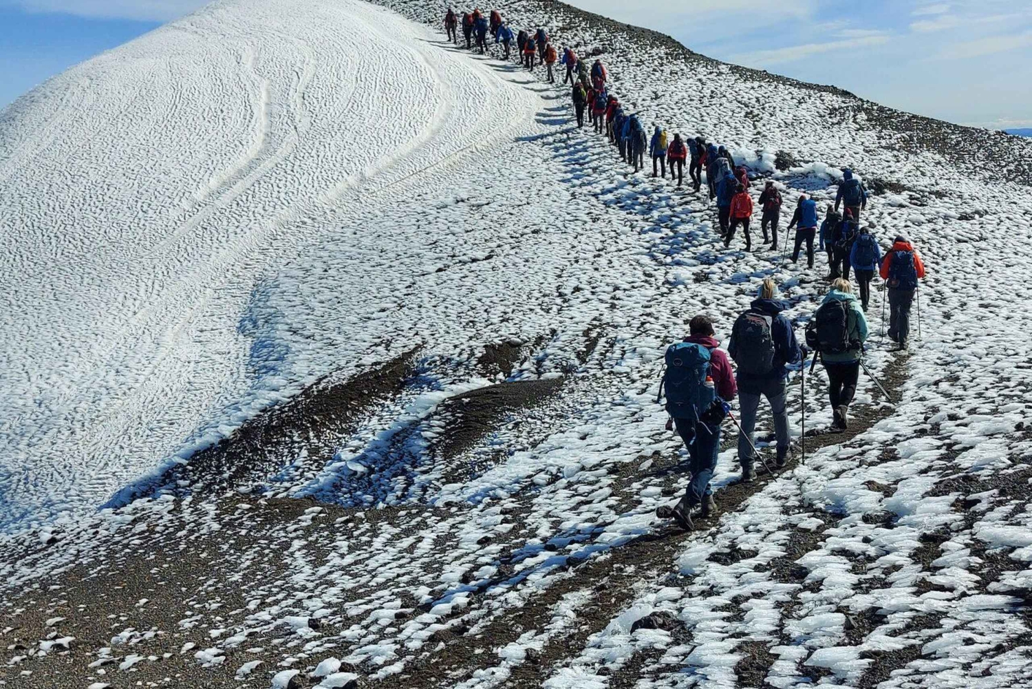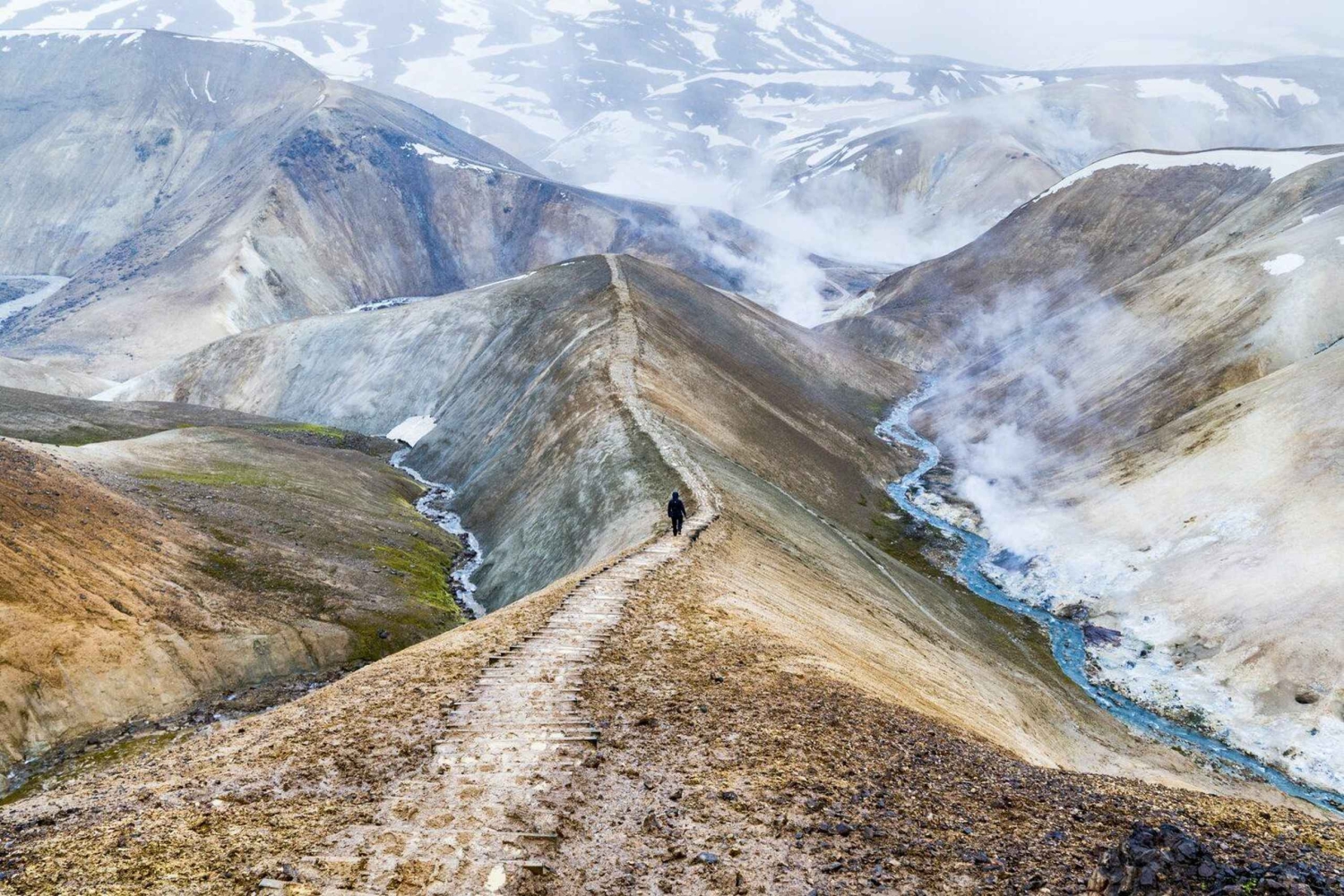 アイスランドの素晴らしいケルリンガルフィヨルズル山脈での壮大なハイキングツアーに参加しましょう。アイスランドの高地の地熱渓谷、雪原、温泉、山頂、氷河の川をご覧ください。