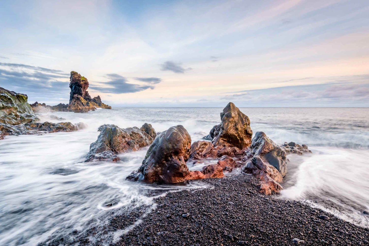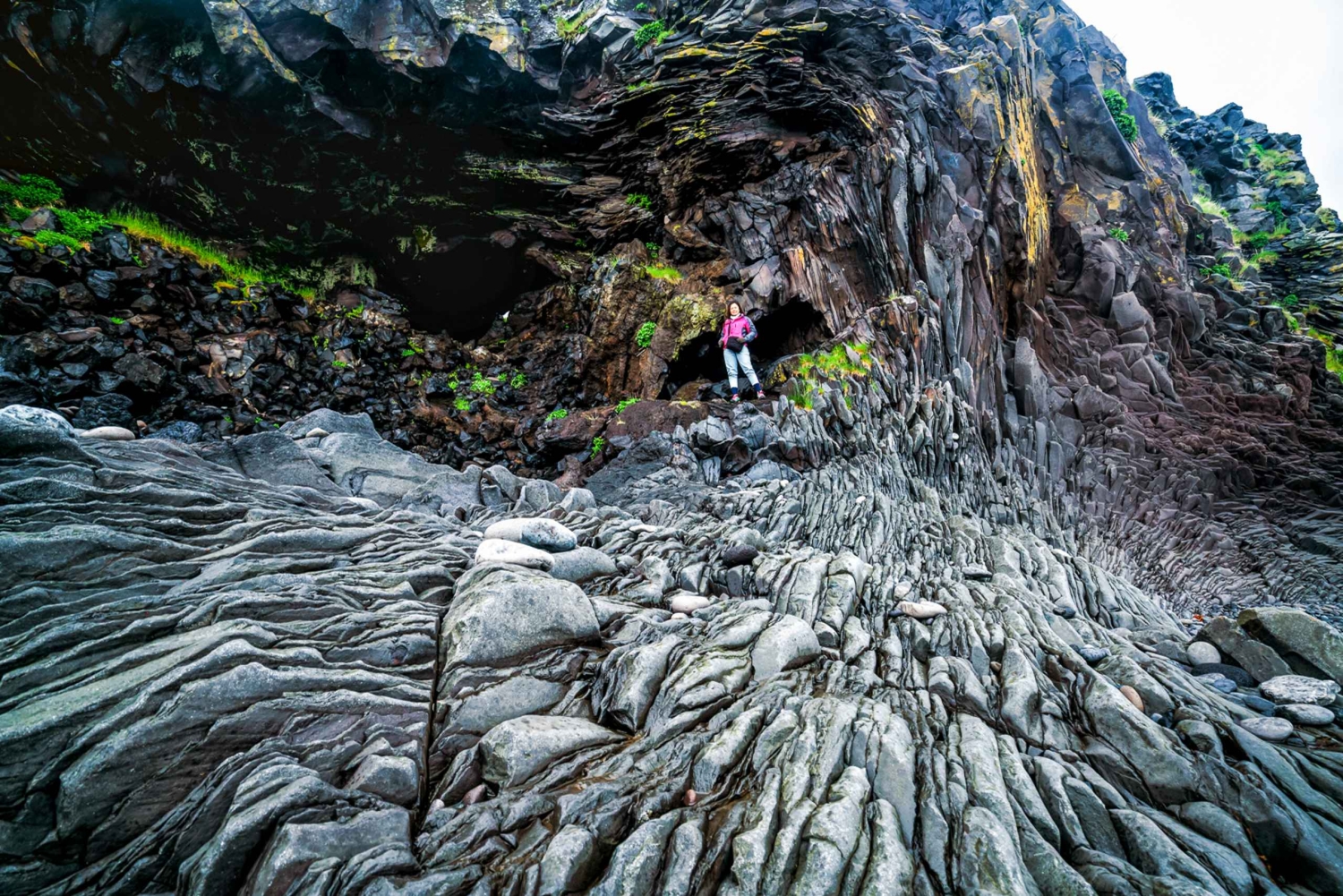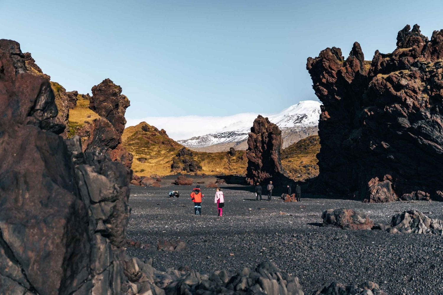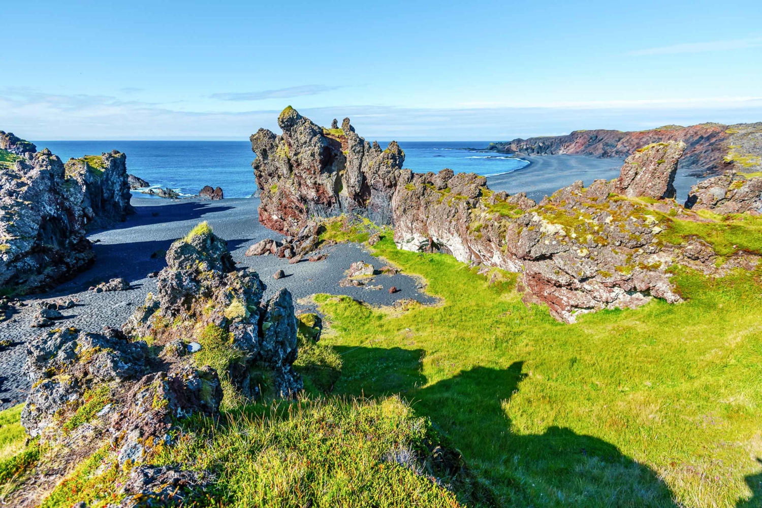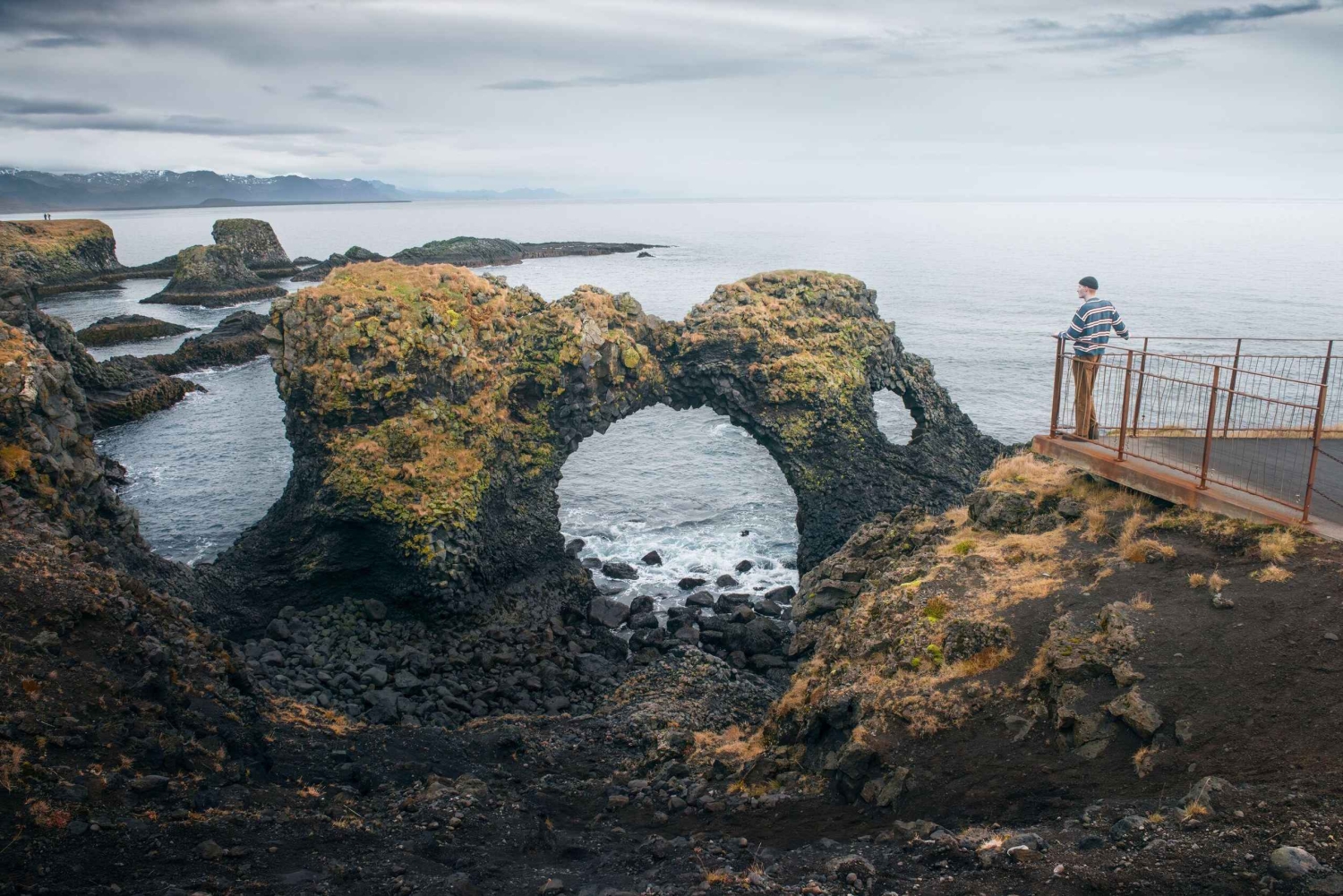 スナイフェルスネス半島へのバス旅行で「ミニチュア アイスランド」を発見してください。柔らかい苔に覆われた溶岩原の風景に驚嘆し、豊富な鳥類や多様な植物を探し、ジューパロンサンドゥルの砂浜や湾などを訪れてください。