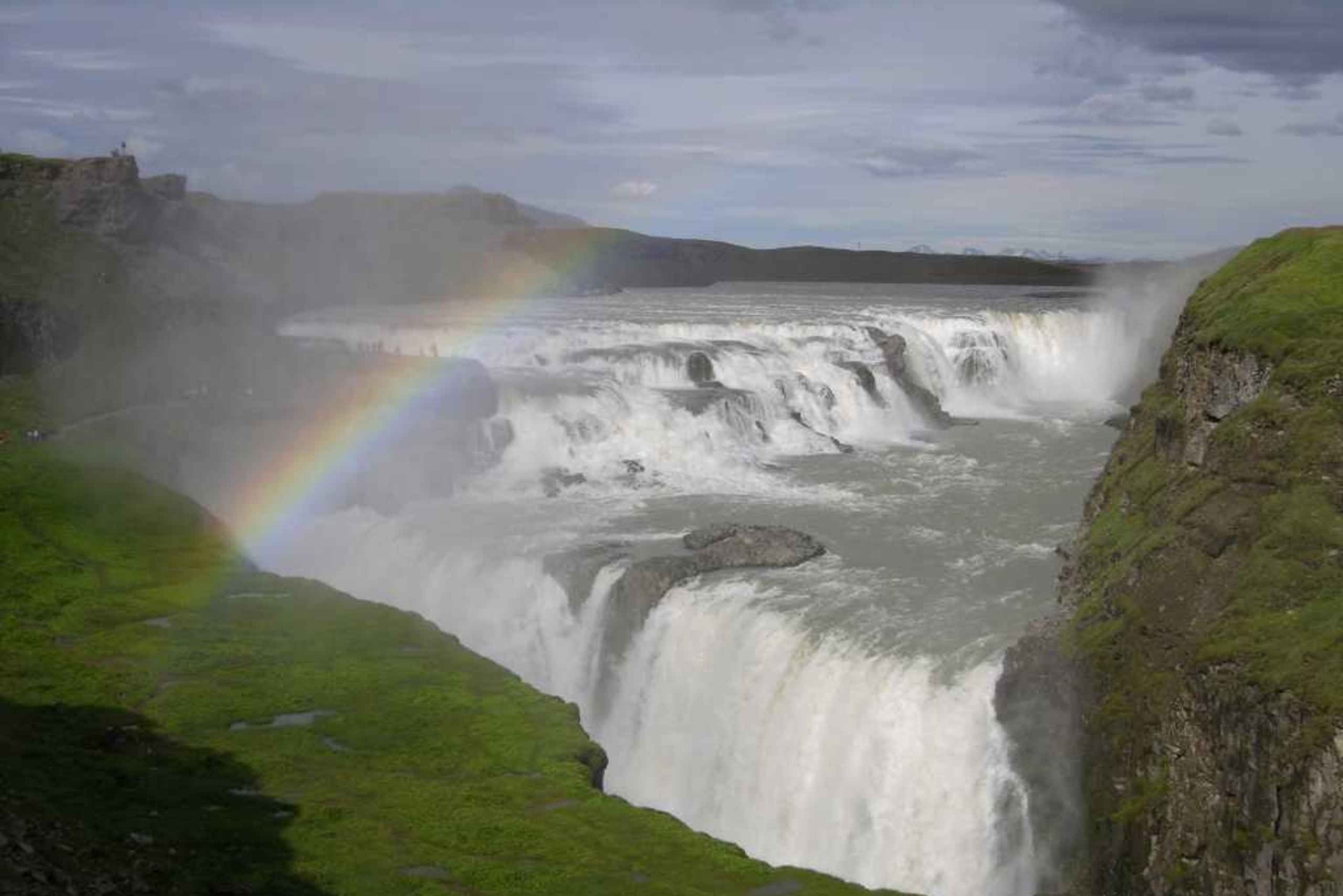 Op een paar minuten rijden ligt de Gullfoss (Gouden Watervallen) waterval. Bewonder het witte water dat met een val van 32 meter naar beneden stort in een indrukwekkende kloof. Op een zonnige dag kun je door de motregen heen een regenboog zien, en in de winter is het tafereel nog spectaculairder, als een deel van de Gullfoss bevriest!