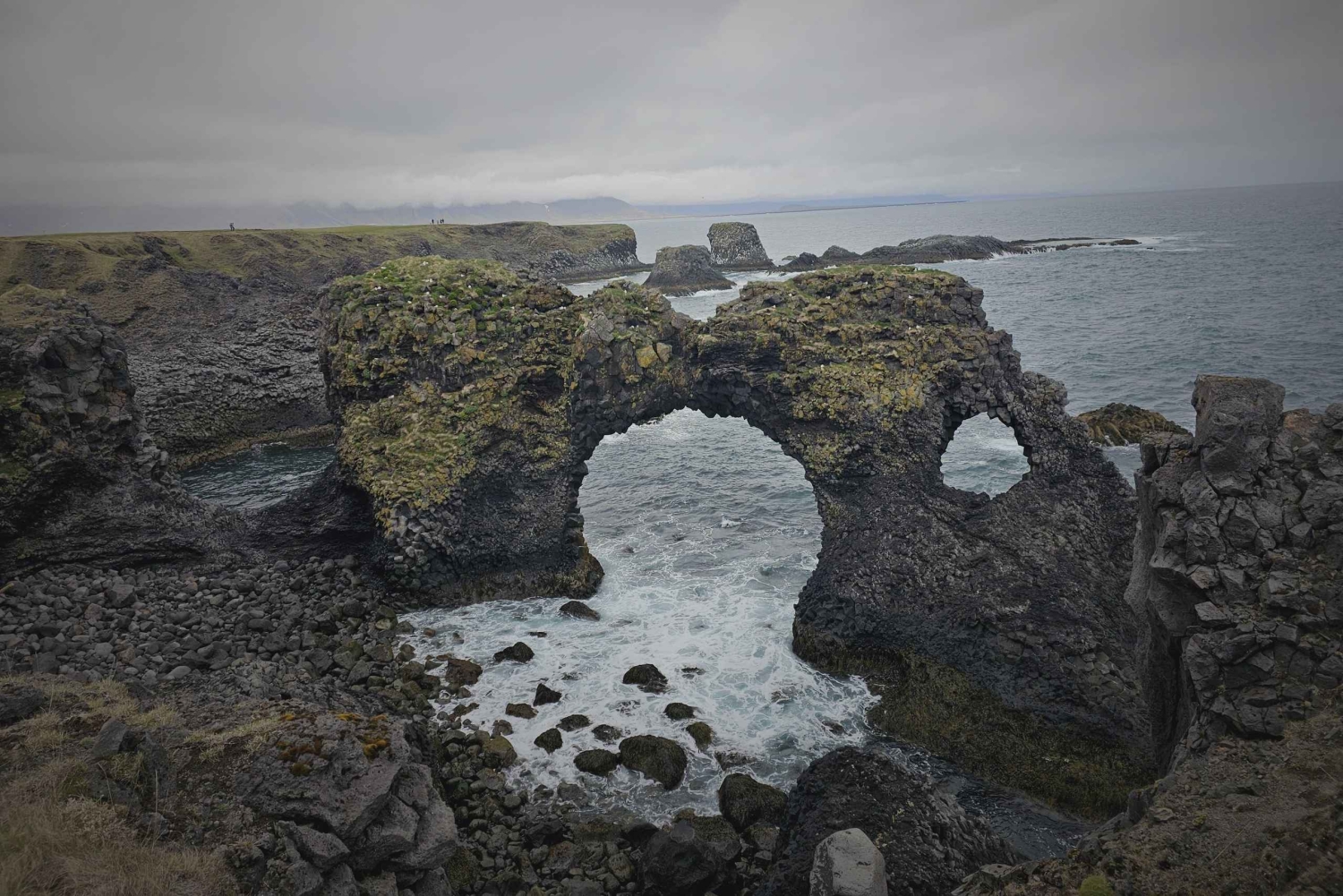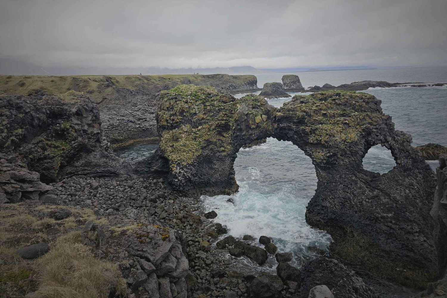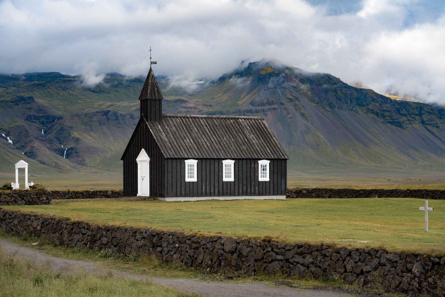 Ga verder naar het dramatische Djupalonssandur Strand, waar zwart zand en verspreide resten van scheepswrakken verhalen over de maritieme geschiedenis van IJsland. Op het strand liggen ook gladde kiezels die bekend staan als 'hijsstenen', die ooit door vissers werden gebruikt om hun kracht te testen. Waag je van daaruit aan de opvallende Lóndrangar Basalt Cliffs, waar torenhoge vulkanische rotsformaties dramatisch oprijzen tegen de beukende golven van de Atlantische Oceaan en een ontzagwekkend kustlandschap creëren. Ontdek het charmante dorpje Arnarstapi, met zijn schilderachtige vissershuisjes, natuurstenen bogen en schilderachtige wandelpaden die langs de kliffen kronkelen en een prachtig uitzicht bieden op de oceaan en de omringende bergen.