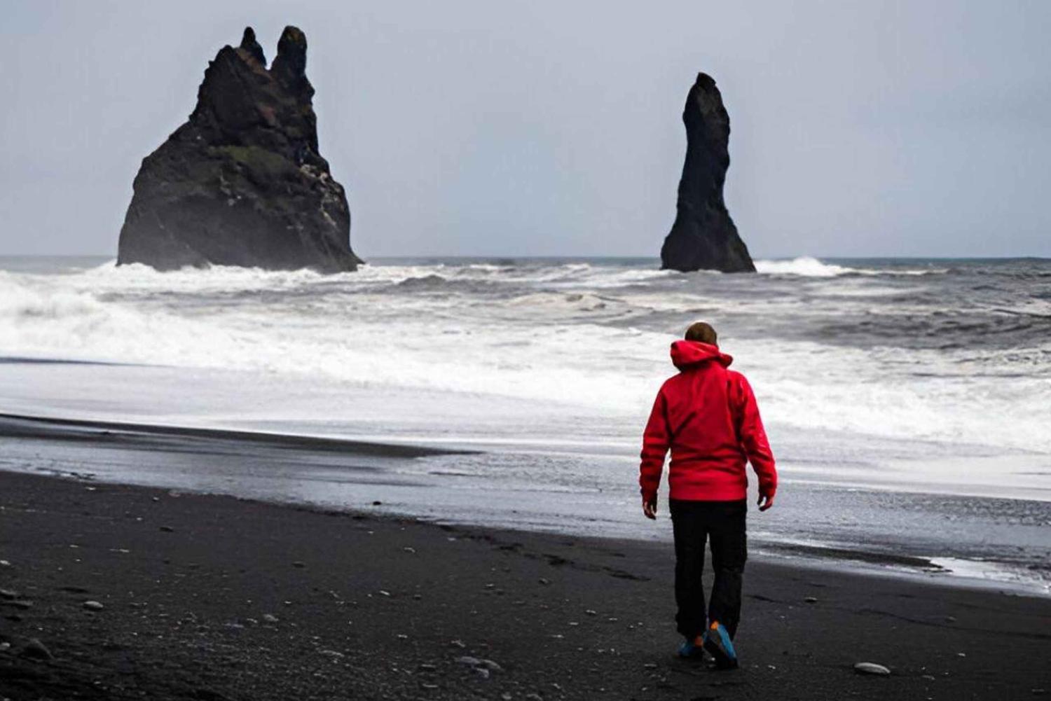 Continue to Sólheimajökull Glacier, where you can witness the striking blue ice and rugged formations up close. Then make your way to the world-famous Reynisfjara black sand beach, home to basalt columns, roaring Atlantic waves, and the dramatic Reynisdrangar sea stacks.