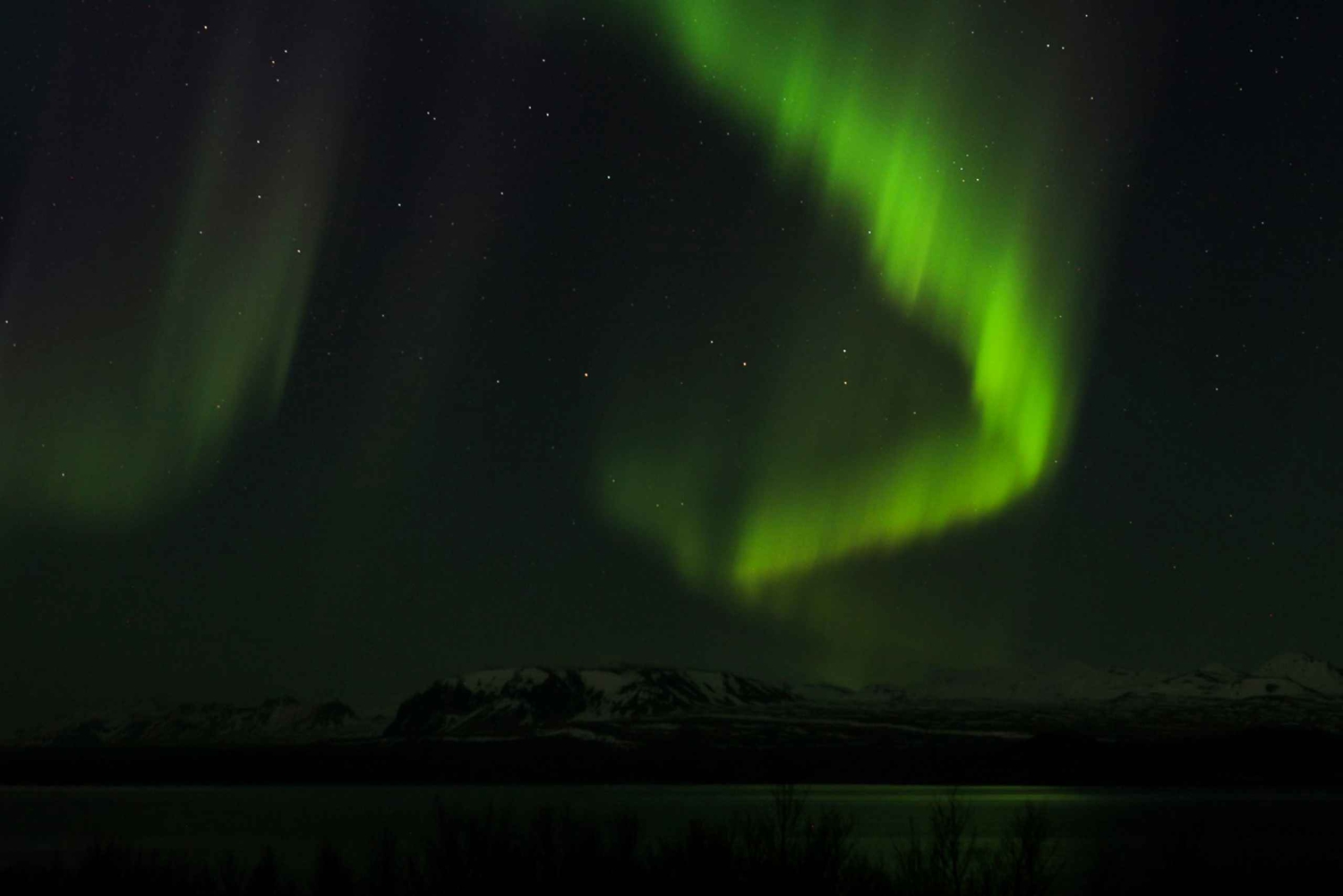 Parte das luzes brilhantes do centro da cidade de Reykjavík para ver as luzes dançantes da Aurora Boreal. Também conhecida como 'Luzes do Norte', é um dos espectáculos mais espectaculares durante os meses de inverno.