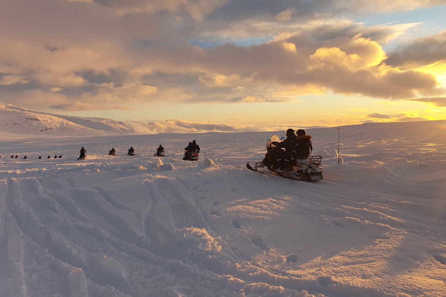 Explora o Círculo Dourado e faz Snowmobiling num Super Jeep. Visita locais emblemáticos como o Parque Nacional de Thingvellir, as Termas de Geysir e a Cascata de Gullfoss, seguido de um passeio de mota de neve em Langjökull.