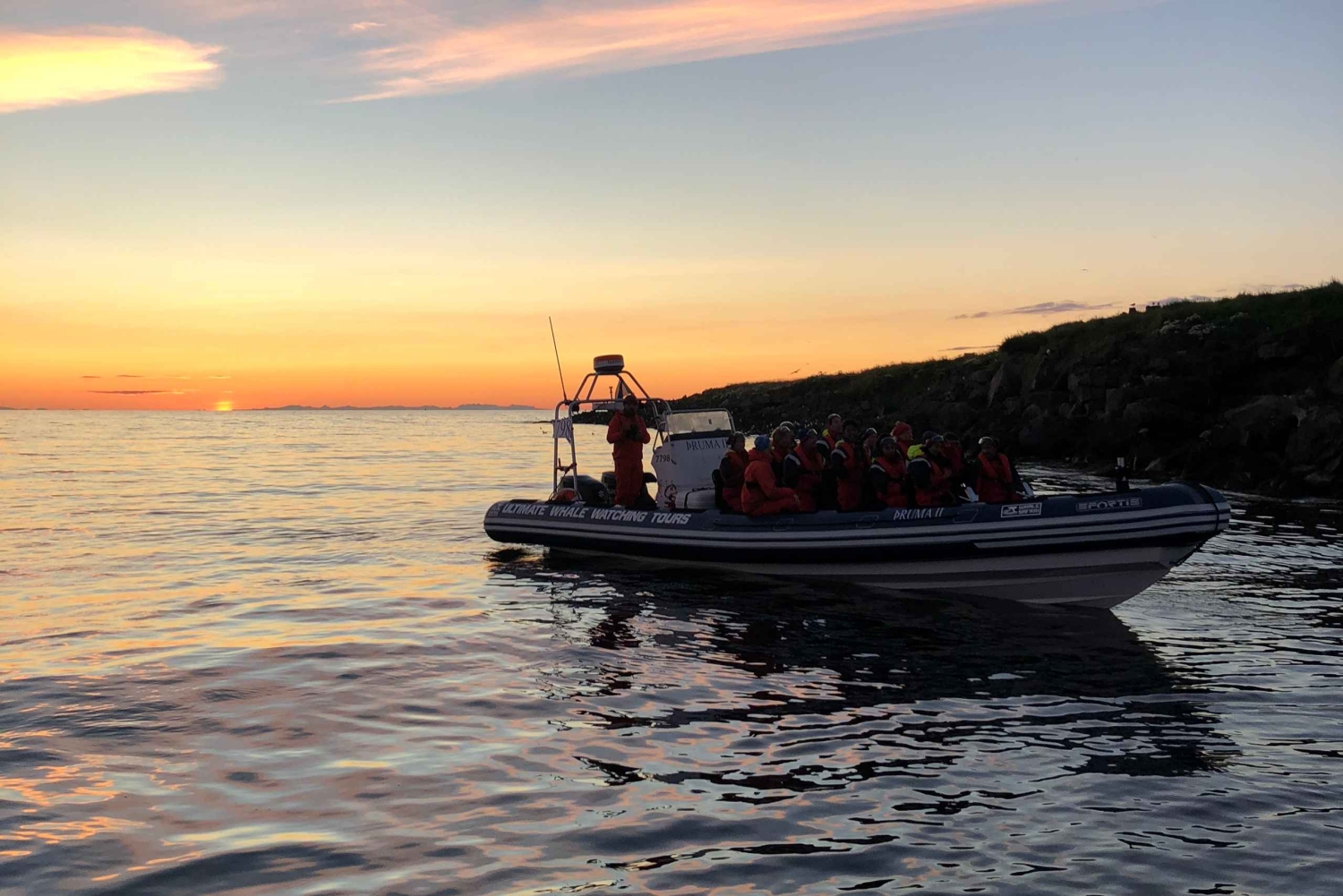 Aproveite ao máximo o seu dia e curta as horas douradas do sol da meia-noite aparentemente infinito no mar. Aproveite um passeio de observação de baleias que parte do Porto Velho de Reykjavík em um barco RIB feito sob medida.