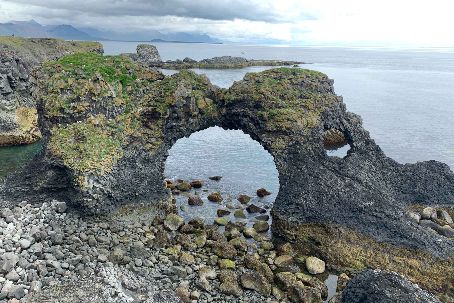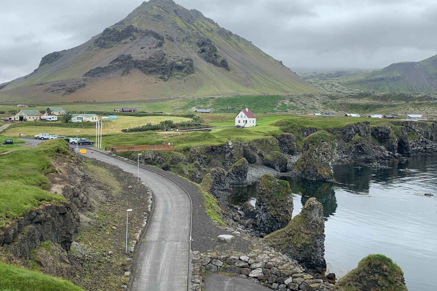 A ponta ocidental da península é o parque nacional recém-designado, incluindo a geleira Snæfellsjokull e deslumbrantes praias costeiras e penhascos. Visitaremos um mirante no sopé da geleira, que ficou famoso no romance Viagem ao Centro da Terra, escrito pelo romancista francês Júlio Verne. Buðir, que significa 'lojas', era o antigo posto comercial da área há muitos anos. O que resta hoje são ruínas quase invisíveis deste antigo posto comercial vibrante. Hotel Budir. Pararemos para tomar um café no Buðir Hotel, um dos hotéis rurais mais populares da Islândia e frequentemente usado como um ponto de encontro remoto e refúgio para celebridades islandesas e estrangeiras. Você nunca sabe quem pode encontrar! Arnarstapi. Desceremos até a pequena vila em Arnarstapi para ver os belos penhascos e vistas desta área. Há uma caminhada panorâmica de 2,5 km de Arnastapi a Hellnar, que você também pode aproveitar. Café Fjoruhusid. Visitaremos o pequeno povoado de Hellnar, uma cidade praticamente situada abaixo da geleira na beira do oceano. Aves marinhas e penhascos dominam a área. Durante o verão, parada para almoço 8 não incluída) no Café Fjöruhúsið localizado em um ótimo local quente perto da praia. Daqui você desfrutará de vistas incríveis e ouvirá um canto intenso de pássaros! Djupalonssandur. Então aproveitaremos um tempo na praia em Djúpalónssandur, mas em vez de nadar, coletaremos seixos de pedra ou pedras de lava naturalmente polidas na beira do surf. Nossa última parada é Ólafsvík, uma vila de pescadores exposta ao clima. Seu dia agitado chega ao fim de volta ao seu ponto de partida!