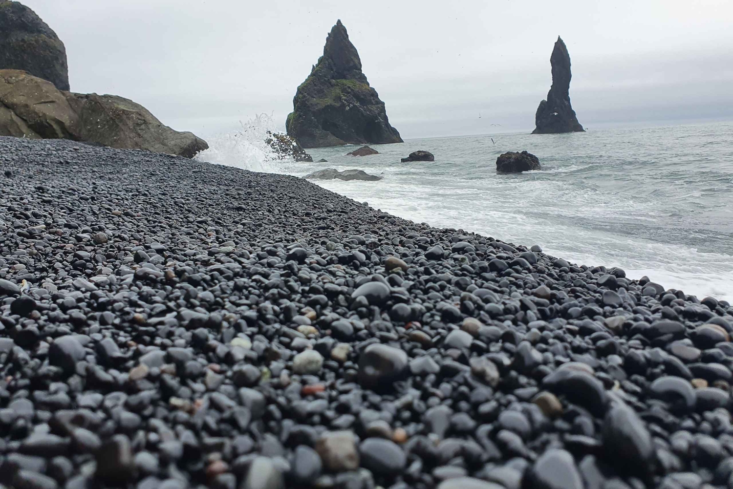Далее мы продолжили путь и остановились на прогулке вдоль побережья пляжа Рейнисфьяра, недалеко от деревни Вик. Он считается самым впечатляющим пляжем с черным песком в Исландии, с уникальными вертикально сдвинутыми базальтовыми колоннами, напоминающими пирамиду с каменными ступенями. В воде напротив пляжа вы также увидите базальтовые скалы потрясающей формы Рейнисдрангар. После этого мы развернемся и поедем обратно в Рейкьявик.