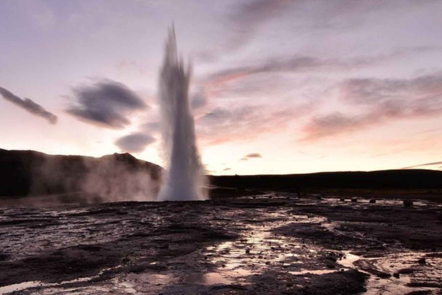 Исследуйте Золотое кольцо под чарующим светом полуночного солнца в рамках экскурсии на микроавтобусе из Рейкьявика. Посетите Тингвеллир, Хаукадалур, Гюдльфосс и кратер Керид без толп туристов!