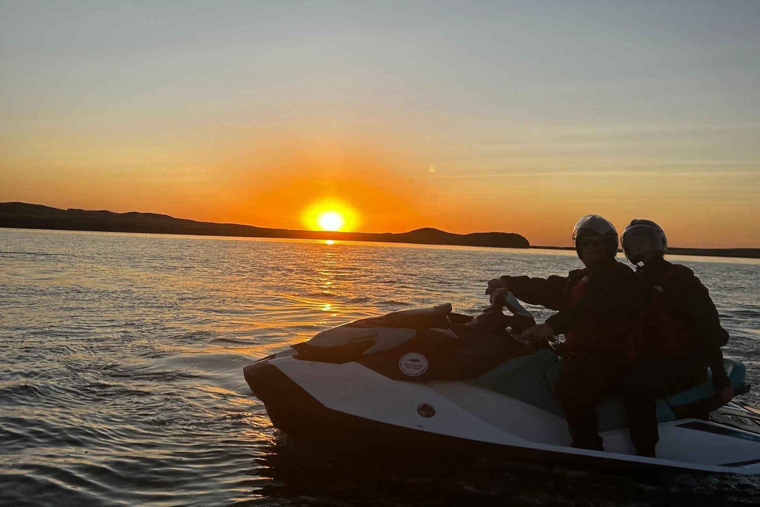 Vi börjar vid vår bas i Gufunes, där du får på dig en varm, fleecefodrad torrdräkt för att hålla dig bekväm ute på vattnet. Efter en kort säkerhetsgenomgång ger vi oss ut på våra vattenskotrar och kör in i bukten precis när solen börjar gå ner.